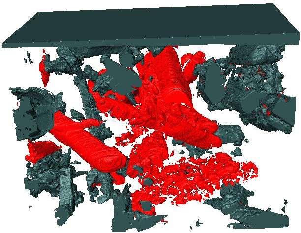 Figure 2. Coating containing 15% vol. of SrCrO4 particles; the image was reconstructed from serial sectioning using a focused ion beam (FIB) accompanied by serial SEM imaging. SrCrO4 particles (grey) and voids (red) are shown after exposure of the sample to NaCl solution. The field of view is 12 × 12 µm.