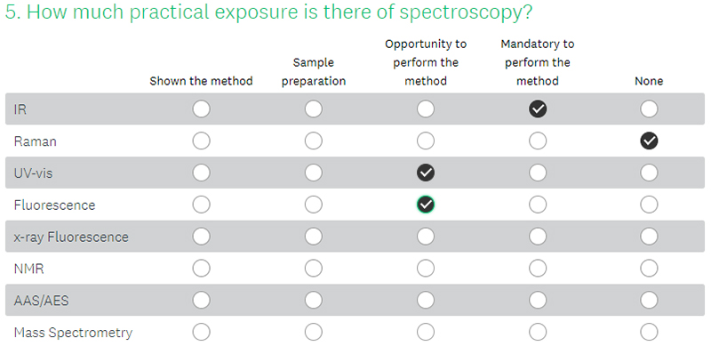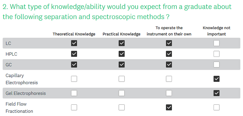 The Academics’ Survey specifically looks into whether the taught curriculum addresses such issues just in the lecture material, in lab classes or whether the students’ learning experience is aimed at giving them the skills to be trusted to operate the analytical equipment. An interesting aspect which the survey also looks into is whether the modules are optional or part of the core curriculum. In other words, can a student manage to become fully qualified at the same time as avoiding courses in areas that their future employers regard as a key skill area? Here again the educational methodology and the pressure on students varies greatly between countries. Some countries’ universities have strict timetables for the students to adhere to, with graduation usually achieved at a set date, known in advance of starting the course. Other educational practises involve students being expected to create their own educational experience by signing up to certain numbers of core or subsidiary modules every year. They build up a portfolio of credits based on the level at which they have achieved the correct grades in these selected modules and can even carry these credits across between universities if they wish to move establishments.